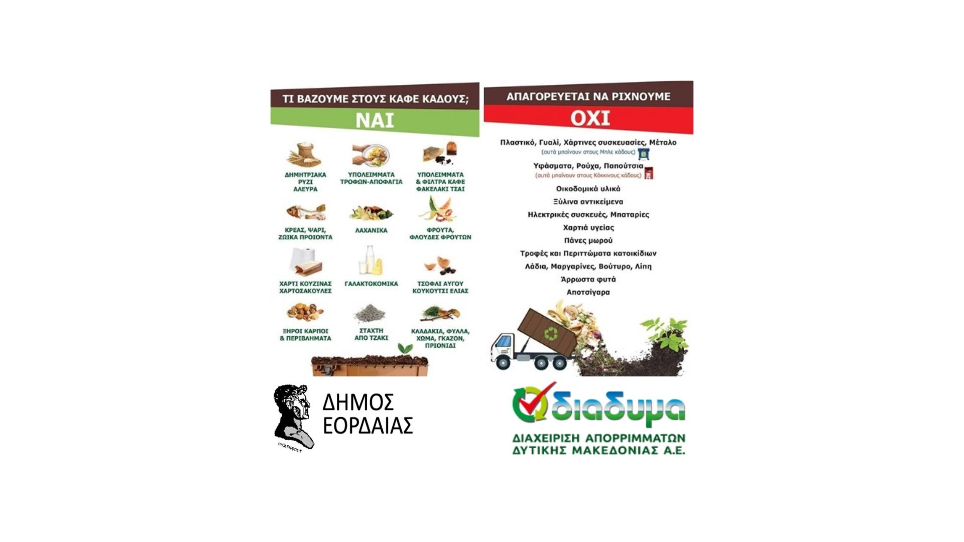 «Ο δήμος Εορδαίας εντάσσει στην καθημερινότητα των δημοτών ένα ακόμη ρεύμα ανακύκλωσης, τη χωριστή συλλογή υπολειμμάτων τροφών. Με στόχο την εφαρμογή της νέας νομοθεσίας (άρθρο 50 του Ν.4819/2021), που αναφέρει την υποχρέωση όλων να συμμετέχουν στη χωριστή συλλογή βιοαποβλήτων, ο δήμος προχωράει σε σταδιακή εφαρμογή του προγράμματος καφέ κάδου στις επιχειρήσεις και στις κατοικίες. Σε αυτή την προσπάθεια χρειαζόμαστε την υποστήριξη όλων των συμπολιτών μας. Τα οφέλη από τη χρήση του συστήματος των καφέ κάδων εστιάζονται στην μείωση του όγκου των απορριμμάτων που καταλήγουν συνήθως στο ΧΥΤΑ και στην ανάκτηση των υλικών και την επανάχρησή τους ως κόμποστ, συνιστώσες που ενισχύουν την κυκλική οικονομία συμβάλλοντας στην υιοθέτηση μιας πιο φιλικής στάσης στο περιβάλλον», τονίζει ο δήμαρχος Εορδαίας, Παναγιώτης Ν. Πλακεντάς.