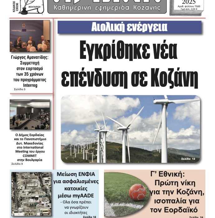 Στο σημερινό της πρωτοσέλιδο, η Πρωινή Κοζάνης αναδεικνύει μια σημαντική εξέλιξη για την περιοχή: την έγκριση νέας επένδυσης στον τομέα της αιολικής ενέργειας, που αναμένεται να ενισχύσει τη μετάβαση της Δυτικής Μακεδονίας σε ένα πιο «πράσινο» ενεργειακό μοντέλο.