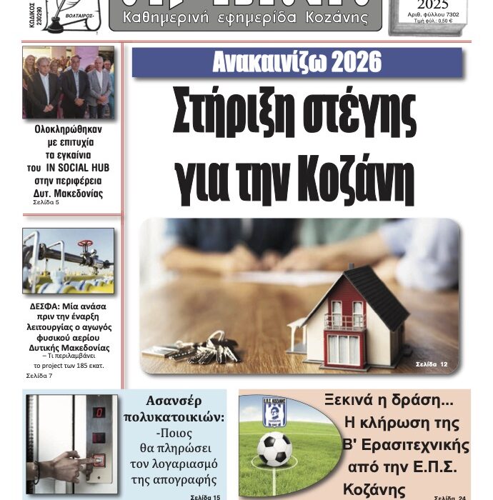 Το μεγάλο πρωτοσέλιδο αφορά το πρόγραμμα “Ανακαινίζω 2026”, που προωθεί τη στήριξη της κατοικίας μέσω επιδοτήσεων και ενισχύσεων για ενεργειακή ή λειτουργική αναβάθμιση. Το μήνυμα είναι ξεκάθαρο: στήριξη στην ιδιοκατοίκηση και τη βελτίωση των συνθηκών διαβίωσης των πολιτών. Η Κοζάνη φαίνεται να βρίσκεται στο επίκεντρο των νέων δράσεων, κάτι που έχει ιδιαίτερη σημασία δεδομένων των οικονομικών πιέσεων που αντιμετωπίζουν πολλά νοικοκυριά.
