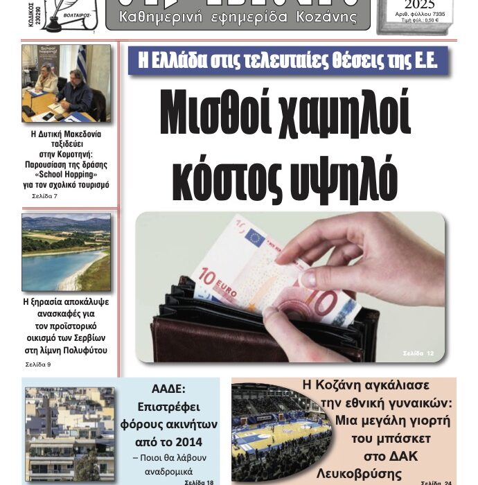 Το πρωτοσέλιδο της εφημερίδας «Πρωινή Κοζάνης» της Παρασκευής 14 Νοεμβρίου 2025 εστιάζει κυρίως στα οικονομικά ζητήματα και στη θέση της Ελλάδας στην Ευρωπαϊκή Ένωση. Ο κεντρικός τίτλος είναι «Μισθοί χαμηλοί, κόστος υψηλό», υπογραμμίζοντας τη διαφορά ανάμεσα στους χαμηλούς μισθούς και το αυξημένο κόστος ζωής. Η εφημερίδα αναφέρει ότι η Ελλάδα βρίσκεται στις τελευταίες θέσεις της Ε.Ε. ως προς την αγοραστική δύναμη και τα εισοδήματα.