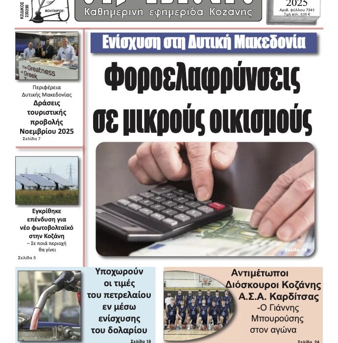 Το σημερινό πρωτοσέλιδο της Πρωινής Κοζάνης δίνει έμφαση στις σημαντικές φοροελαφρύνσεις που προωθούνται για μικρούς οικισμούς της Δυτικής Μακεδονίας, μια εξέλιξη που αναμένεται να στηρίξει νοικοκυριά και τοπικές κοινότητες που αντιμετωπίζουν χρόνια προβλήματα βιωσιμότητας.