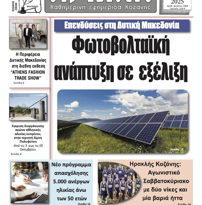 Η «Πρωινή Κοζάνης» της Τετάρτης 1 Οκτωβρίου 2025 αναδεικνύει ως βασικό ζήτημα την αναπτυσσόμενη φωτοβολταϊκή δραστηριότητα στη Δυτική Μακεδονία. Οι ενεργειακές επενδύσεις που βρίσκονται σε εξέλιξη δείχνουν πως η περιοχή συνεχίζει να πρωταγωνιστεί στην πράσινη μετάβαση και στη νέα εποχή των Ανανεώσιμων Πηγών Ενέργειας.