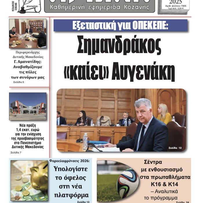 Το πρωτοσέλιδο της εφημερίδας “Πρωινή” Κοζάνης, της Πέμπτης 2 Οκτωβρίου 2025, δίνει έμφαση σε ένα μείγμα πολιτικών, περιφερειακών και κοινωνικών θεμάτων με επίκεντρο την επικαιρότητα της Δυτικής Μακεδονίας, αλλά και γενικότερου εθνικού ενδιαφέροντος.