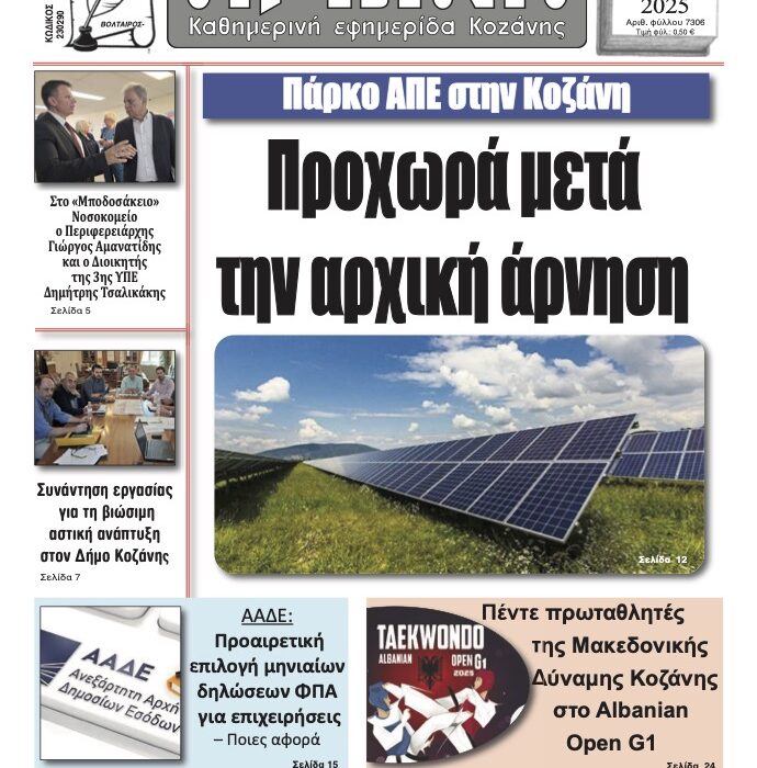 Το σημερινό πρωτοσέλιδο της εφημερίδας «Πρωινή Κοζάνης» (Παρασκευή 3 Οκτωβρίου 2025) αποτυπώνει μια ποικιλία θεμάτων που αφορούν την επικαιρότητα της περιοχής, δίνοντας έμφαση τόσο στην ενεργειακή μετάβαση όσο και στις κοινωνικές και αθλητικές δραστηριότητες.