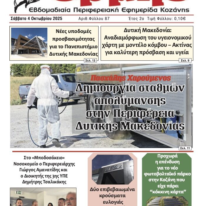 Κυρίαρχο θέμα είναι η δημιουργία σταθμών απολύμανσης στην Περιφέρεια, ένα έργο που φαίνεται να υλοποιείται με την επίβλεψη του Πασχάλη Χαροήμενου. Η εικόνα με τον εργαζόμενο σε πλήρη προστατευτική στολή ενισχύει τη σοβαρότητα του μέτρου και υποδηλώνει ότι πρόκειται για δράση πρόληψης με πιθανή αφορμή υγειονομικές ανησυχίες. Το θέμα αυτό συνδέεται έμμεσα με το ρεπορτάζ που βρίσκεται πιο κάτω στο φύλλο και αφορά την επιβεβαίωση δύο κρουσμάτων ευλογιάς στην Περιφερειακή Ενότητα Κοζάνης, εξέλιξη που προκάλεσε άμεση αντίδραση από τις αρχές, με την επιβολή απαγόρευσης διακίνησης ζώων.