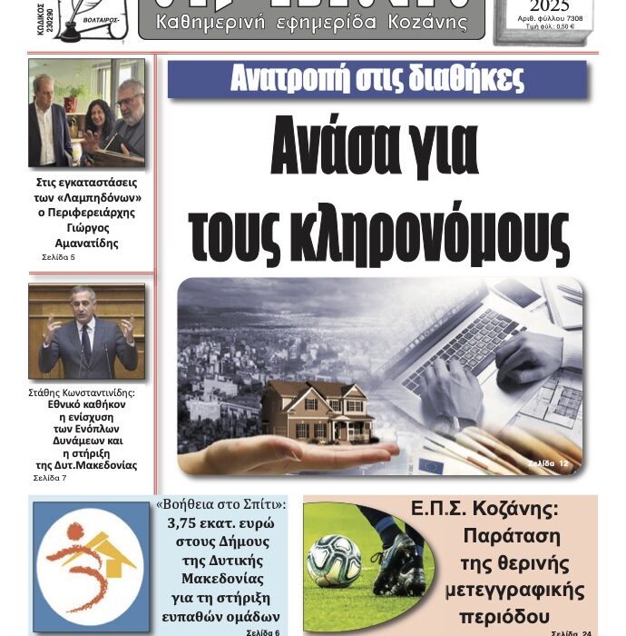 Το πρωτοσέλιδο της εφημερίδας «Πρωινή» Κοζάνης επικεντρώνεται σε μια σημαντική εξέλιξη που αφορά τις κληρονομιές. Ο κεντρικός τίτλος «Ανάσα για τους κληρονόμους» συνοδεύεται από τον υπέρτιτλο «Ανατροπή στις διαθήκες», αφήνοντας να εννοηθεί ότι έχει προκύψει κάποια σημαντική αλλαγή στο νομικό πλαίσιο που διέπει τις διαθήκες ή τις κληρονομιές γενικότερα. Το ρεπορτάζ φαίνεται να παρουσιάζει θετικές εξελίξεις για τους πολίτες που εμπλέκονται σε τέτοιες διαδικασίες, πιθανώς με διευκολύνσεις ή νέες ρυθμίσεις, και παραπέμπεται στη σελίδα 12.