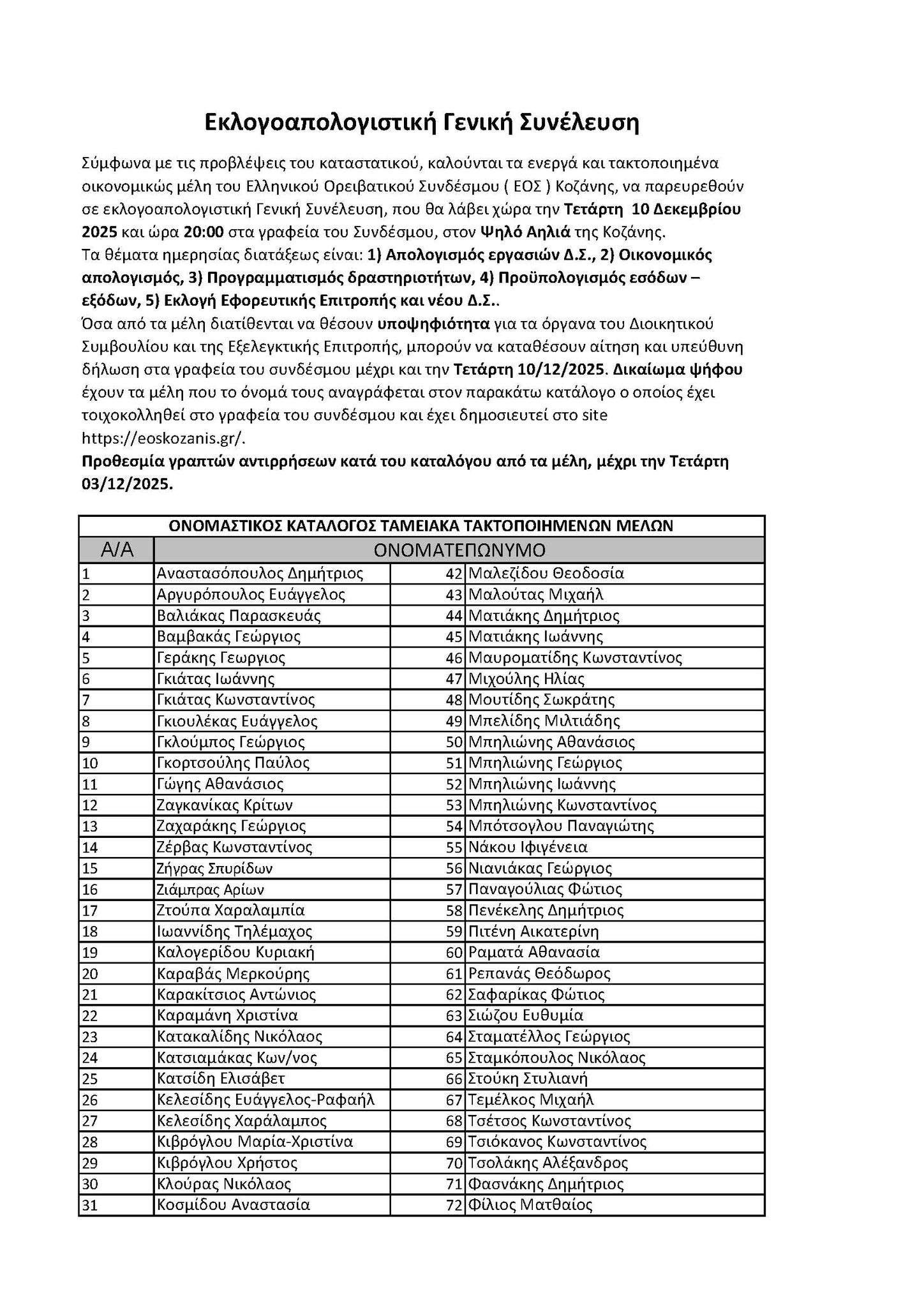 Σύμφωνα με τις προβλέψεις του καταστατικού, καλούνται τα ενεργά και τακτοποιημένα οικονομικώς μέλη του Ελληνικού Ορειβατικού Συνδέσμου ( ΕΟΣ ) Κοζάνης, να παρευρεθούν σε εκλογοαπολογιστική Γενική Συνέλευση, που θα λάβει χώρα την Τετάρτη 10 Δεκεμβρίου 2025 και ώρα 20:00 στα γραφεία του Συνδέσμου, στον Ψηλό Αηλιά της Κοζάνης.