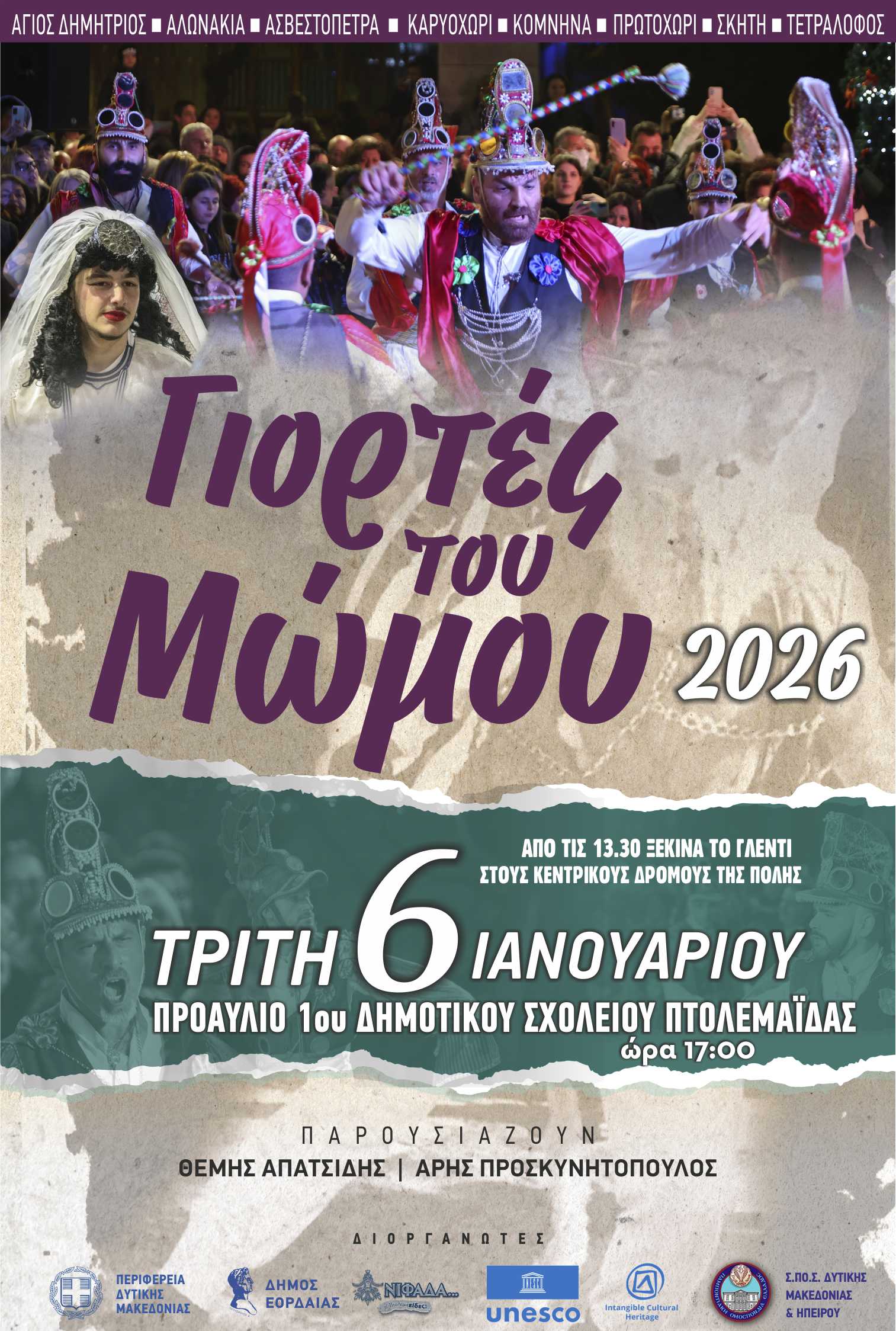 «Γιορτές του Μώμου 2026» Οι Μωμόγεροι στην Πτολεμαΐδα την Τρίτη 6 Ιανουαρίου 2026 και ώρα 5μμ στο 1ο Δημοτικό Σχολείο