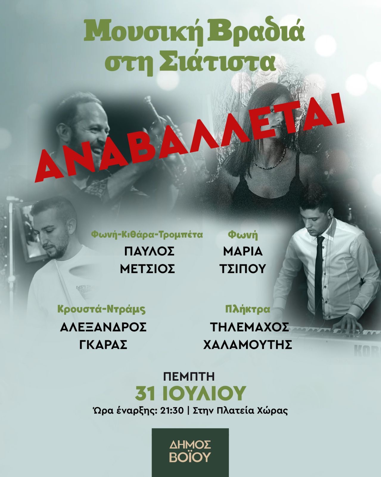 Η προγραμματισμένη εκδήλωση «Μουσική Βραδιά» που επρόκειτο να πραγματοποιηθεί σήμερα Πέμπτη 31 Ιουλίου στην Πλατεία της Χώρας στη Σιάτιστα, αναβάλλεται λόγω καιρικών συνθηκών.