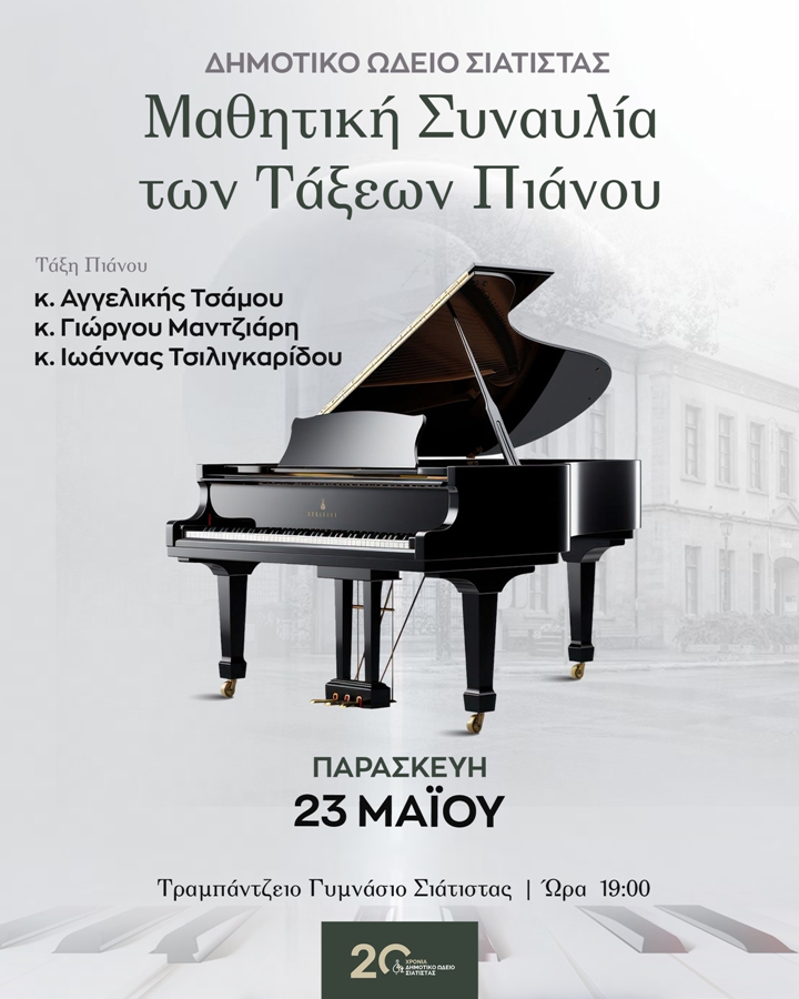 Στο πλαίσιο των εκδηλώσεων για 20 χρόνια λειτουργίας του Δημοτικού Ωδείου Σιάτιστας, θα πραγματοποιηθεί την Παρασκευή 23 Μαΐου συναυλία των μαθητικών τάξεων πιάνου στις 7μ.μ. στο Τραμπάντζειο Γυμνάσιο Σιάτιστας.