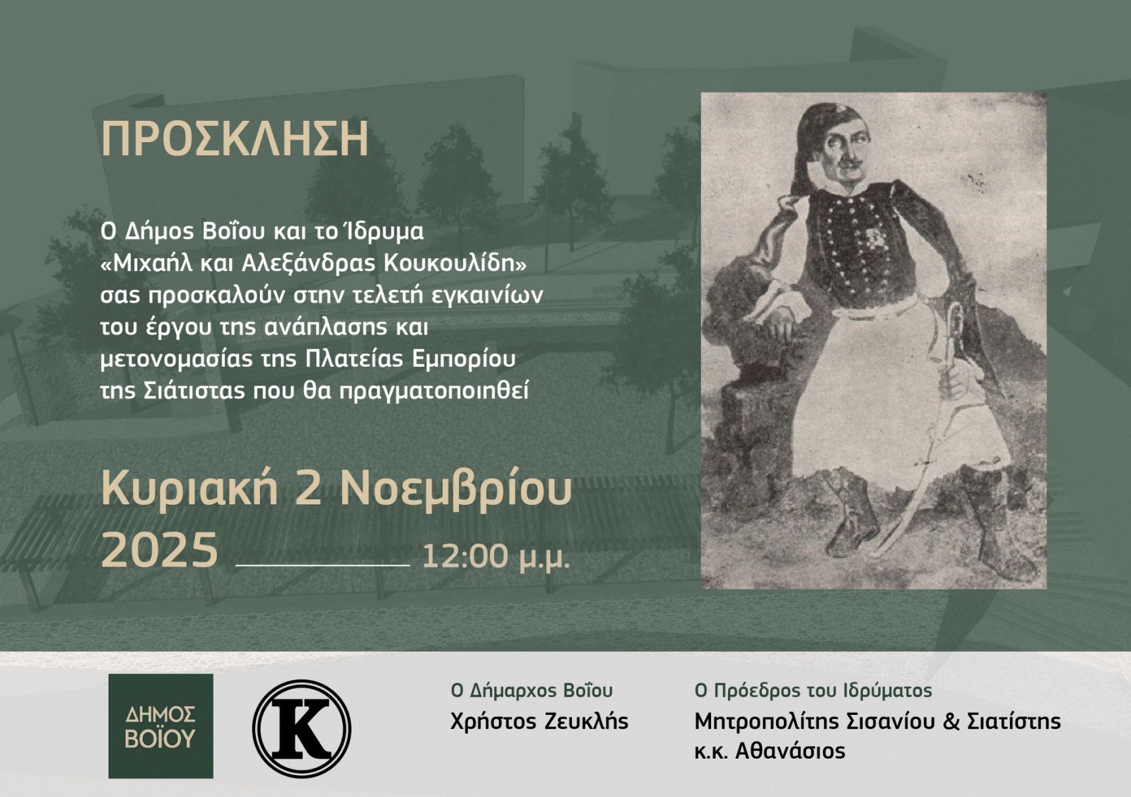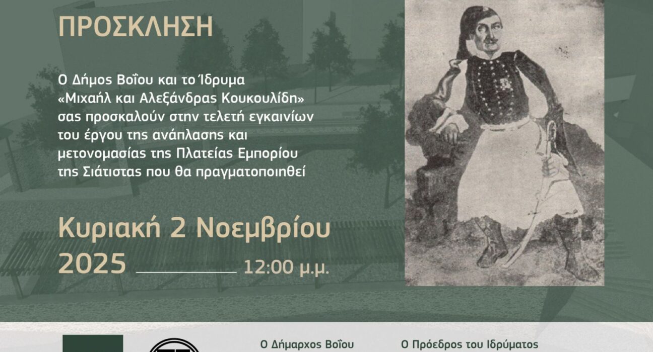 Κοζάνη Δήμος Βοΐου: Τελετή Εγκαινίων της Πλατείας Εμπορίου Σιάτιστας 30 Οκτωβρίου 2025 345 Views Κυριακή 2 Νοεμβρίου Ο Δήμος Βοΐου και το Ίδρυμα «Μιχαήλ & Αλεξάνδρας Κουκουλίδη» σας προσκαλούν στην τελετή εγκαινίων του έργου ανάπλασης και μετονομασίας της Πλατείας Εμπορίου Σιάτιστας. Ώρα Έναρξης: 12:00 μ.μ. Πλατεία Εμπορίου Σιάτιστας