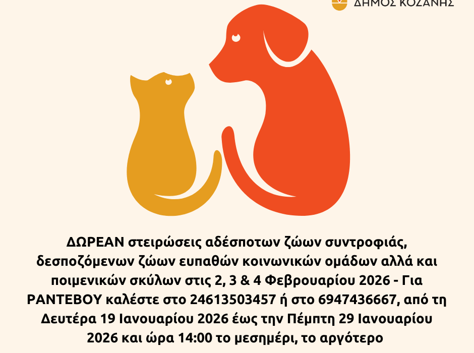 Δήμος Κοζάνης: ΔΩΡΕΑΝ στειρώσεις αδέσποτων ζώων συντροφιάς, δεσποζόμενων ζώων ευπαθών κοινωνικών ομάδων αλλά και ποιμενικών σκύλων στις 2, 3 & 4 Φεβρουαρίου 2026 – Για ΡΑΝΤΕΒΟΥ καλέστε στο 24613503457 ή στο 6947436667, από τη Δευτέρα 19 Ιανουαρίου 2026 έως την Πέμπτη 29 Ιανουαρίου 2026 και ώρα 14:00 το μεσημέρι, το αργότερο