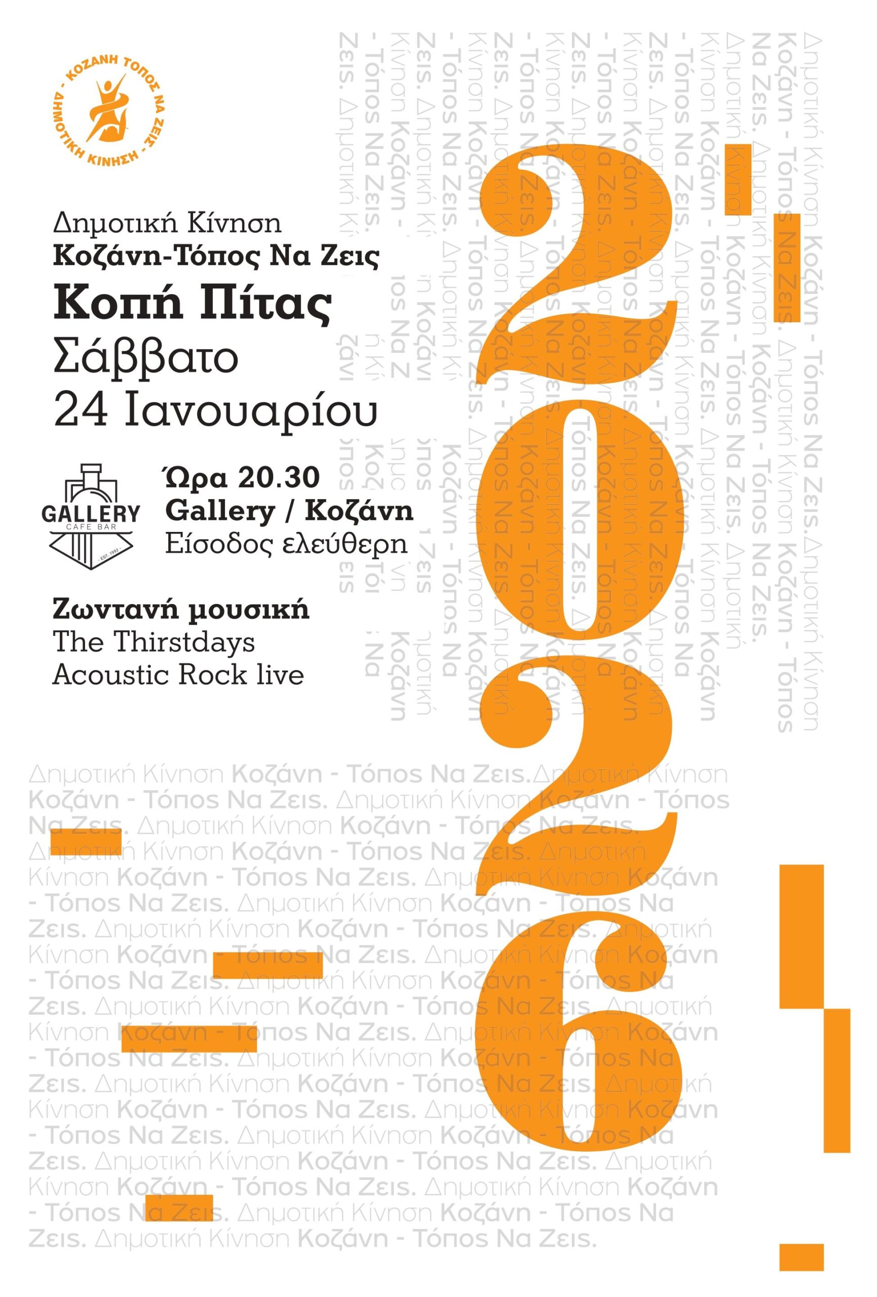 Δημοτική Κίνηση «Κοζάνη – Τόπος να Ζεις» : Κοπή πρωτοχρονιάτικης πίτας στις 24/01/26 στο Gallery Café Bar