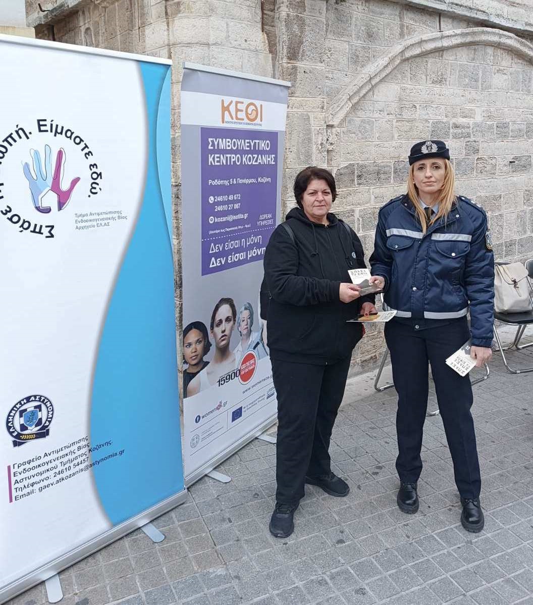 Συγκεκριμένα, πρωινές ώρες (25-11-2025) σε κεντρικά σημεία των πόλεων Κοζάνης, Καστοριάς και Άργους Ορεστικού, αστυνομικοί των Γραφείων Αντιμετώπισης Ενδοοικογενειακής Βίας των Αστυνομικών Τμημάτων Κοζάνης και Καστοριάς, αντίστοιχα, και αστυνομικοί του Αστυνομικού Τμήματος Άργους Ορεστικού Καστοριάς, σε συνεργασία με την επιτροπή ισότητας του Δήμου Άργους Ορεστικού, διένειμαν σε διερχόμενους πολίτες σχετικό έντυπο ενημερωτικό υλικό, για την πρόληψη και την αντιμετώπιση περιστατικών βίας κατά των γυναικών.