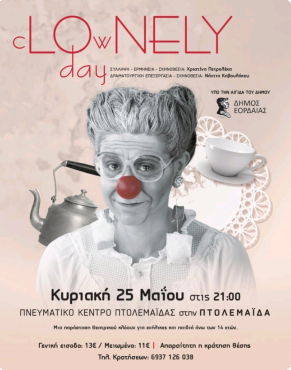 H Διεύθυνση Κοινωνικής Προστασίας, Παιδείας και Πολιτισμού ανακοινώνει ότι διαθέτει δωρεάν εισιτήρια για την θεατρική παράσταση ¨ cLOwNELY day ¨ στους δικαιούχους του Ελάχιστου Εγγυημένου Εισοδήματος (ΚΕΑ).