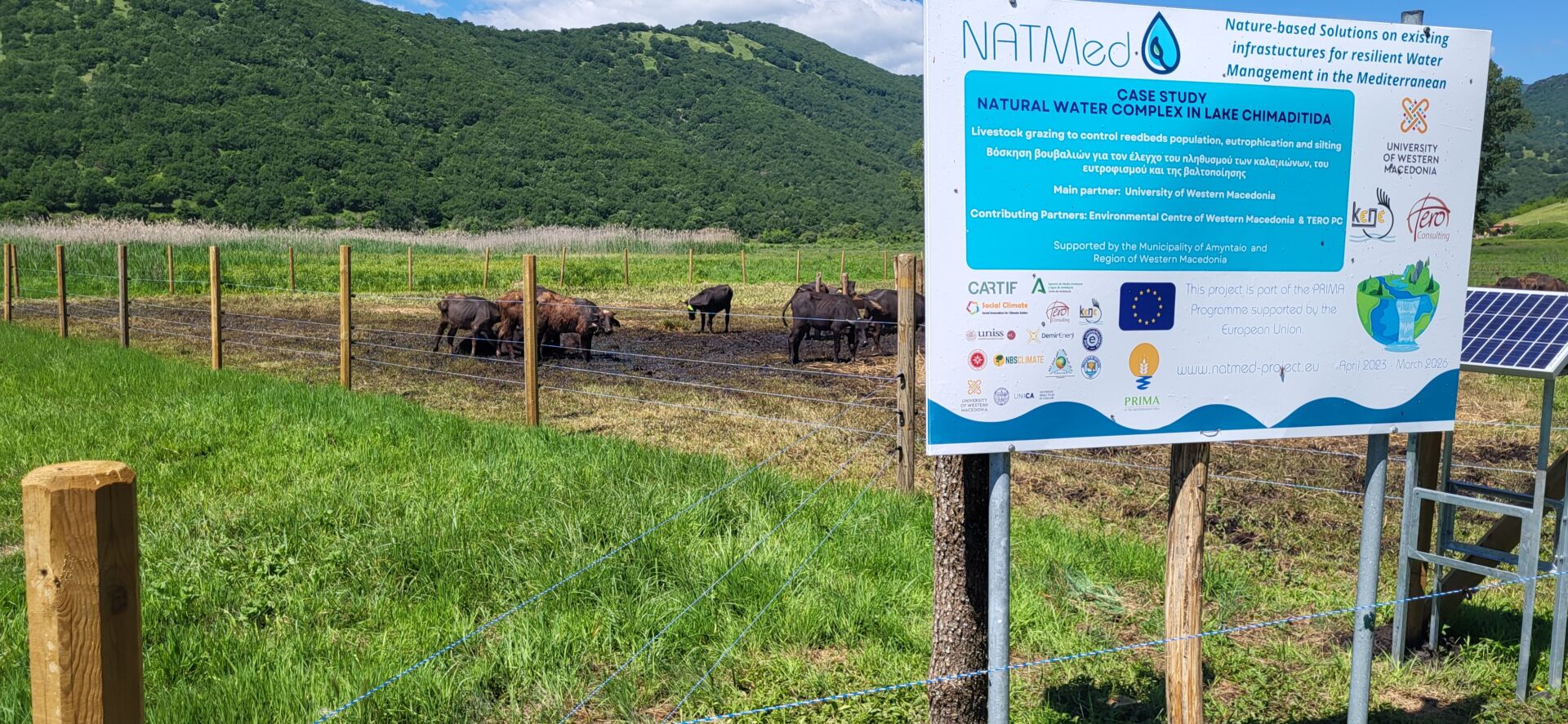 Το έργο ΝΑΤΜed (Nature-based Solutions on existing infrastructures for resilient Water Management in the Mediterranean) αποτελεί ένα, διαχειριστικό, μη τεχνικό, έργο διαχείρισης καλαμιώνα. Το έργο εντάσσεται στο πλαίσιο της καινοτομίας του προγράμματος Horizon2020 Research and innovation, εφαρμόζοντας λύσεις που βασίζονται στη Φύση (Nature Based Solution, Nbs). Τα βουβάλια βρίσκονται στον καλαμιώνα της λίμνης Χειμαδίτιδας για τη διαχείριση του υγροτοπικού οικοσυστήματος. Είναι περιφραγμένα σε προσωρινή μετακινούμενη περίφραξη με ηλεκτροφόρο σύρμα και μετακινούνται σύμφωνα με τη μελέτη διαχείρισης του καλαμιώνα της λίμνης Χειμαδίτιδας. Από το έργο θα προκύψει η συλλογή, η καταγραφή και η αξιολόγηση των δεδομένων από την ελεγχόμενη βόσκηση του καλαμιώνα από βουβάλια. Η εν λόγω δράση αποτελεί κομβικό τμήμα του σχεδιασμού για την ενίσχυση της οικολογικής λειτουργίας της λίμνης, με στόχο την αποκατάσταση της δομής του, τη μείωση της βιομάζας και την αναζωογόνηση του ενδιαιτήματος για την τοπική πανίδα και χλωρίδα.