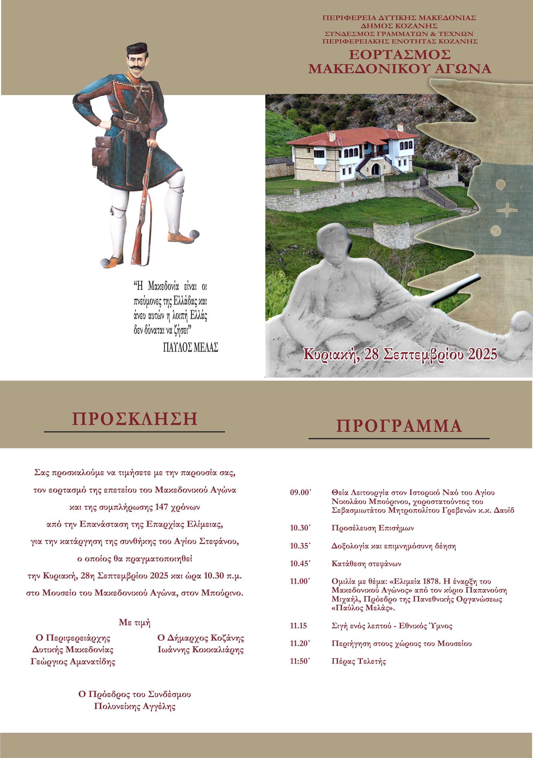 Σας προσκαλούμε να τιμήσετε με την παρουσία σας, τον εορτασμό της επετείου του Μακεδονικού Αγώνα και της συμπλήρωσης 147 χρόνων από την Επανάσταση της Επαρχίας Ελιμειας, για την κατάργηση της συνθήκης του Αγίου Στεφάνου, ο οποίος θα πραγματοποιηθεί την Κυριακη,28η Σεπτεμβρίου 2025 και ώρα 10.30,στο Μουσείο του Μακεδονικού Αγώνα, στο όρος Μπουρινο.