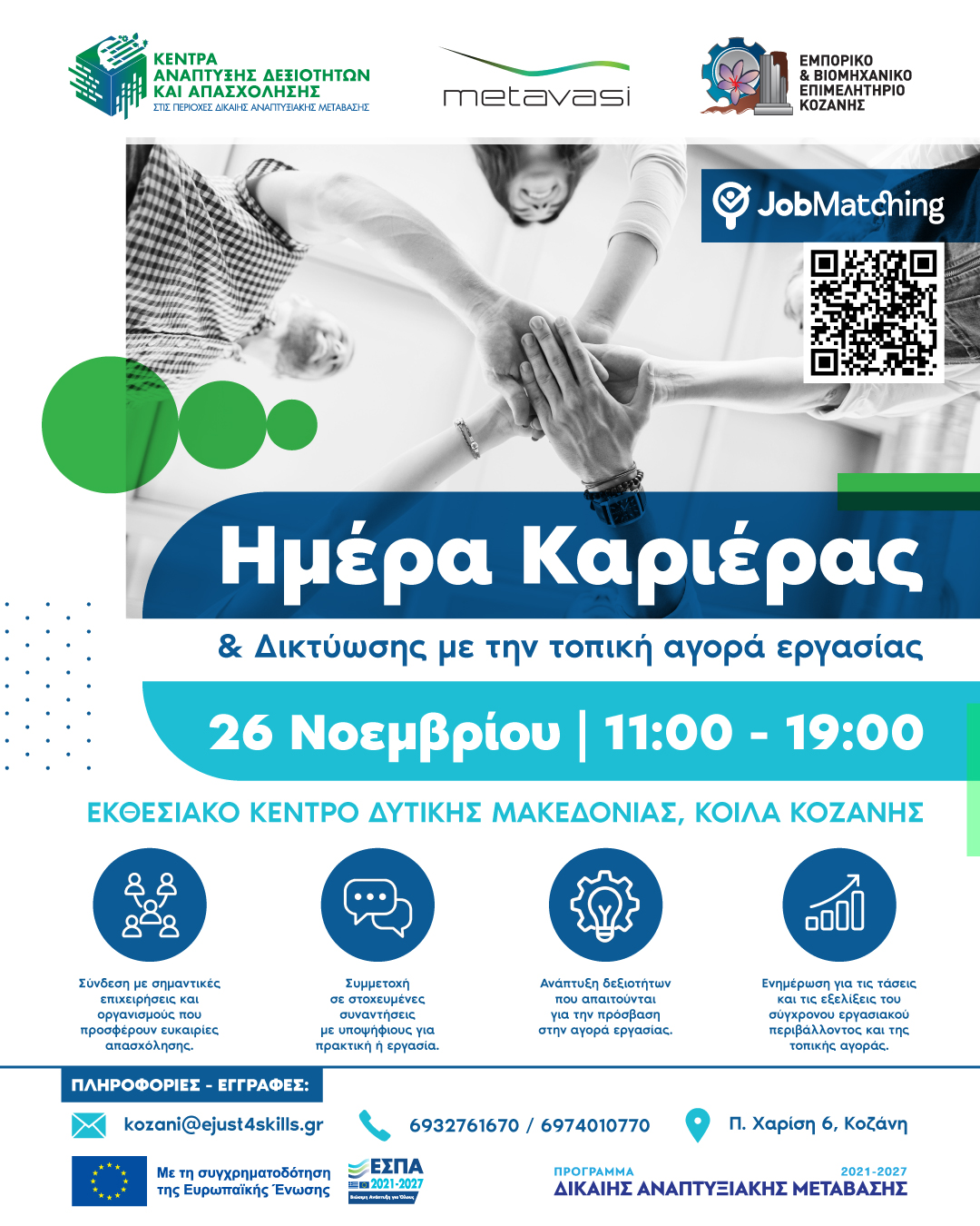 Η Μετάβαση Μ.Α.Ε., σε συνεργασία με το Επιμελητήριο Κοζάνης, διοργανώνουν την Ημέρα Καριέρας & Δικτύωσης με την τοπική αγορά εργασίας, την Τετάρτη 26 Νοεμβρίου 2025, από τις 11:00 έως τις 19:00, στο Εκθεσιακό Κέντρο Δυτικής Μακεδονίας στα Κοίλα Κοζάνης.