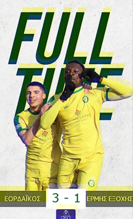 Με πειστική εμφάνιση και αποτελεσματικότητα από τα πρώτα λεπτά, ο Φ.Σ. Εορδαϊκός Πτολεμαΐδας επικράτησε του Ερμή Εξοχής, κατακτώντας μια σημαντική νίκη σε αγώνα που διεξήχθη κάτω από ιδιαίτερα δύσκολες καιρικές συνθήκες. Η ομάδα της Πτολεμαΐδας μπήκε δυναμικά στον αγωνιστικό χώρο και κατάφερε να πάρει προβάδισμα νωρίς, όταν στο 12ο λεπτό ο Καμπούρης άνοιξε το σκορ, ενώ μόλις ένα λεπτό αργότερα ο Ακιτούντε διπλασίασε τα τέρματα, δίνοντας σαφές προβάδισμα στον Εορδαϊκό.