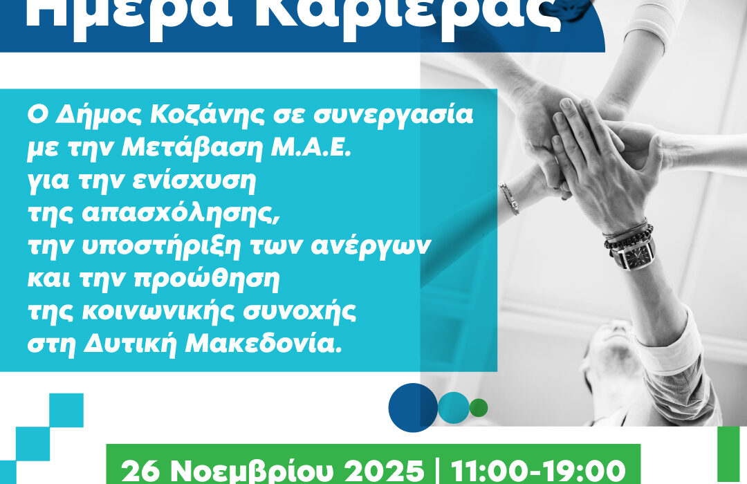 Ο Δήμος Κοζάνης, η Μετάβαση Μ.Α.Ε. και το Επιμελητήριο Κοζάνης, σε συνεργασία με το Πανεπιστήμιο Δυτικής Μακεδονίας, διοργανώνουν την Ημέρα Καριέρας & Δικτύωσης με την τοπική αγορά εργασίας, την Τετάρτη 26 Νοεμβρίου 2025, από τις 11:00 έως τις 19:00, στο Εκθεσιακό Κέντρο Δυτικής Μακεδονίας στα Κοίλα Κοζάνης.