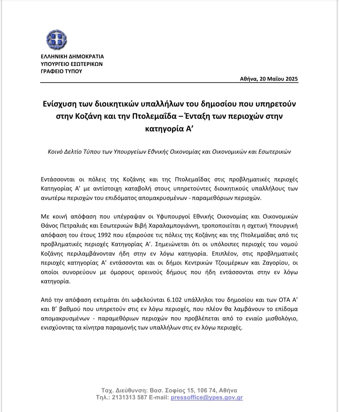 Μετά από επίμονες προσπάθειες και τεκμηριωμένες παρεμβάσεις, η Κοζάνη και η Πτολεμαΐδα εντάσσονται πλέον επίσημα στη Ζώνη Α’ των Παραμεθόριων Περιοχών, όπως ανακοίνωσε το Υπουργείο Εθνικής Οικονομίας και Οικονομικών.
