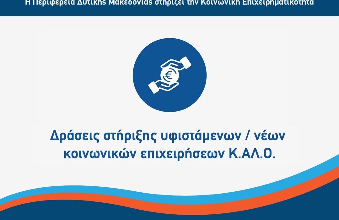 H Περιφέρεια Δυτικής Μακεδονίας και η Ειδική Υπηρεσία Διαχείρισης του Προγράμματος «Δυτική Μακεδονία» 2021-2027, σε συνεργασία με την ΚΕΠΑ-ΑΝΕΜ ΑΜΚΕ, αρμόδιο Εταίρο-Περιφερειακή Μονάδα του Ενδιάμεσου Φορέα του Προγράμματος «Δυτική Μακεδονία» 2021-2027-ΕΦΕΠΑΕ ανακοινώνουν ότι απο τις 14 Ιανουαρίου 2026 και ώρα 13:00 ενεργοποιήθηκε η πλατφόρμα ηλεκτρονικής υποβολής αιτήσεων χρηματοδότησης στο Ολοκληρωμένο Πληροφοριακό Σύστημα Κρατικών Ενισχύσεων (OΠΣΚΕ) στη νέα δράση του ΕΣΠΑ 2021-2027: «Δράσεις στήριξης υφιστάμενων / νέων κοινωνικών επιχειρήσεων Κ.Αλ.Ο.» του Προγράμματος «Δυτική Μακεδονία 2021-2027».