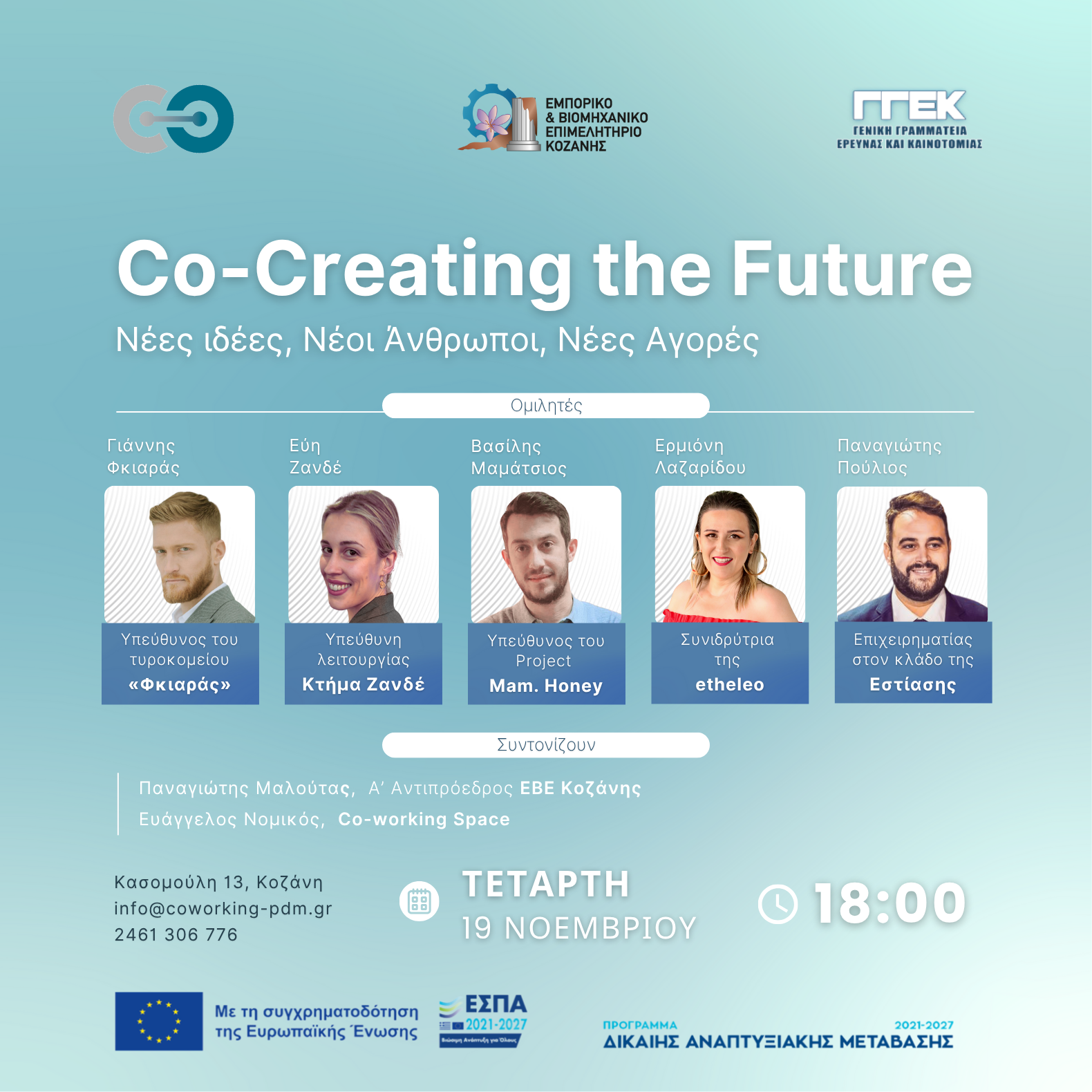 Με επιτυχία ολοκληρώθηκε την Τετάρτη 19 Νοεμβρίου 2025, στον Συνεργατικό Χώρο Εργασίας Δυτικής Μακεδονίας, η ανοιχτή συζήτηση με τίτλο «Co-Creating the Future: Νέες Ιδέες, Νέοι Άνθρωποι, Νέες Αγορές», που διοργανώθηκε σε συνεργασία με το Επιμελητήριο Κοζάνης.