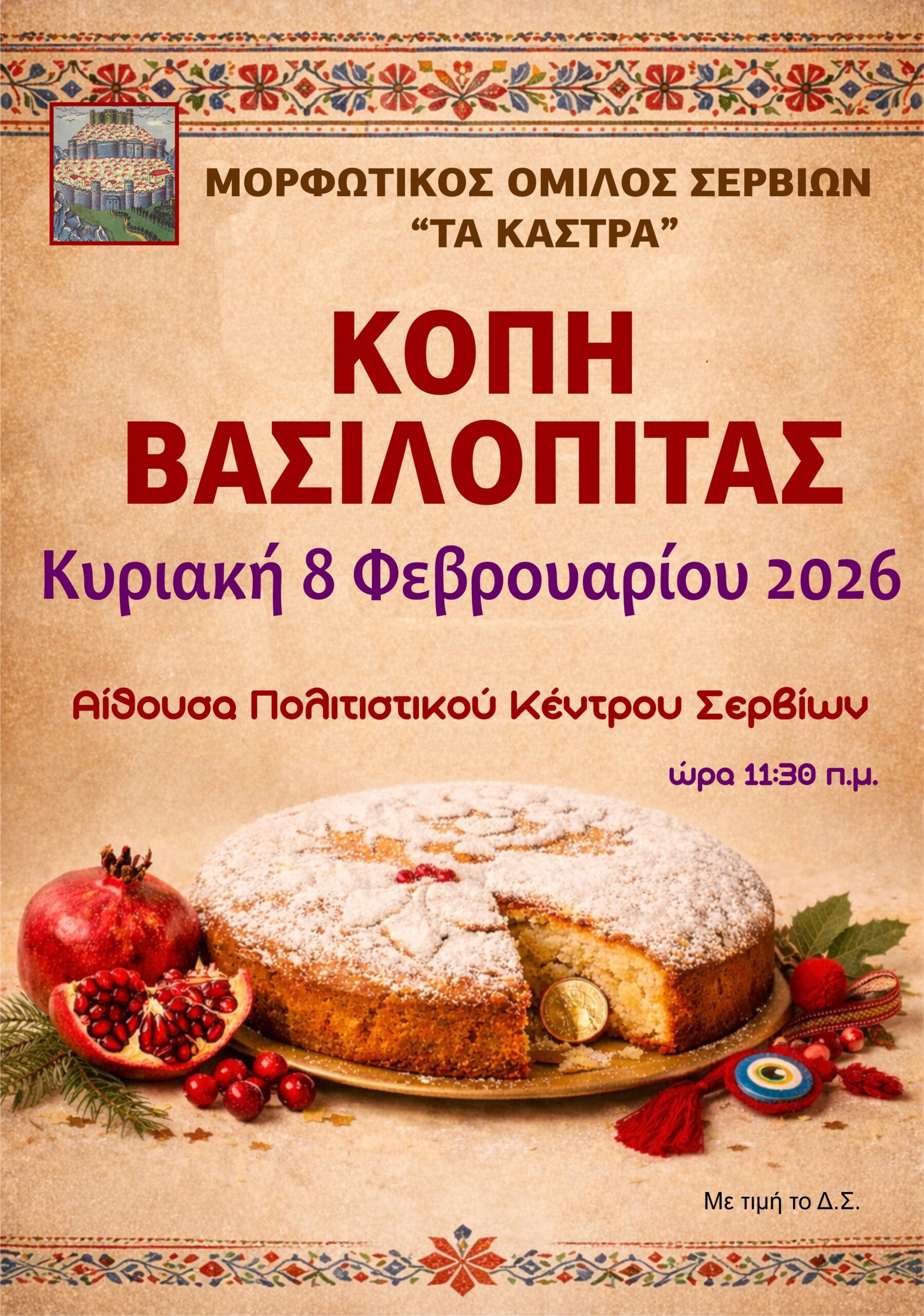 Καλούμε όλα τα Μέλη και τους Φίλους μας την Κυριακή 8 Φεβρουαρίου και ώρα 11.30 π.μ. στην Κοπή της Βασιλόπιτας του Ομίλου μας. Στην εκδήλωση θα παραστεί η Χορωδία του Ομίλου, θα βραβευτούν οι Πρωτεύσαντες στις Πανελλαδικές Εξετάσεις Μαθητές του ΓΕΛ Και του ΕΠΑΛ Σερβίων και θα προσφερθούν δώρα και σε άλλους τυχερούς.