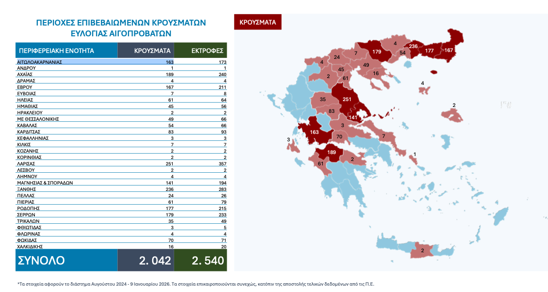 Η ευλογιά των αιγοπροβάτων αποτελεί μία από τις σοβαρότερες ζωονόσους που πλήττουν την ελληνική κτηνοτροφία, προκαλώντας οικονομικές απώλειες και επηρεάζοντας την παραγωγή γάλακτος και κρέατος. Από Αύγουστο 2024 έως 9 Ιανουαρίου 2026, καταγράφηκαν 2.540 εκτροφές με επιβεβαιωμένα κρούσματα, με αποτέλεσμα 470.274 αιγοπρόβατα να θανατωθούν προληπτικά για τον περιορισμό της νόσου.