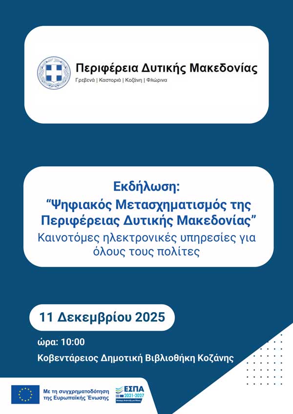 Η Περιφέρεια Δυτικής Μακεδονίας διοργανώνει δύο ενημερωτικές εκδηλώσεις για την παρουσίαση του έργου «Ψηφιακός Μετασχηματισμός με χρήση εφαρμογών Ηλεκτρονικής Διακυβέρνησης», το οποίο έχει ενταχθεί στο Πρόγραμμα «Δυτική Μακεδονία 2021-2027» και συμβάλλει καθοριστικά στον εκσυγχρονισμό των υπηρεσιών και στη βελτίωση της καθημερινής εξυπηρέτησης των πολιτών. Στόχος των ημερίδων είναι η αναλυτική ενημέρωση για τις νέες ψηφιακές δυνατότητες που εισάγει το έργο, καθώς και η παρουσίαση των τεχνολογικών και λειτουργικών αλλαγών που αναβαθμίζουν τη σχέση πολίτη – διοίκησης.