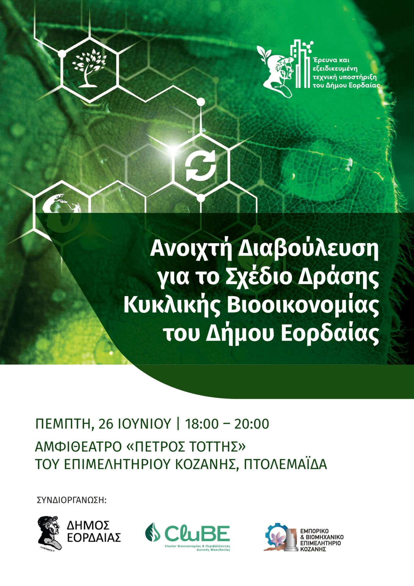 Το Cluster Βιοοικονομίας και Περιβάλλοντος Δυτικής Μακεδονίας (CluBE) σε συνδιοργάνωση με το Επιμελητήριο Κοζάνης και τον Δήμο Εορδαίας σας προσκαλεί να συμμετάσχετε στην Ανοιχτή Διαβούλευση για τις πρώτες εκδόσεις του Σχεδίου Δράσης Κυκλικής Βιοοικονομίας του Δήμου.