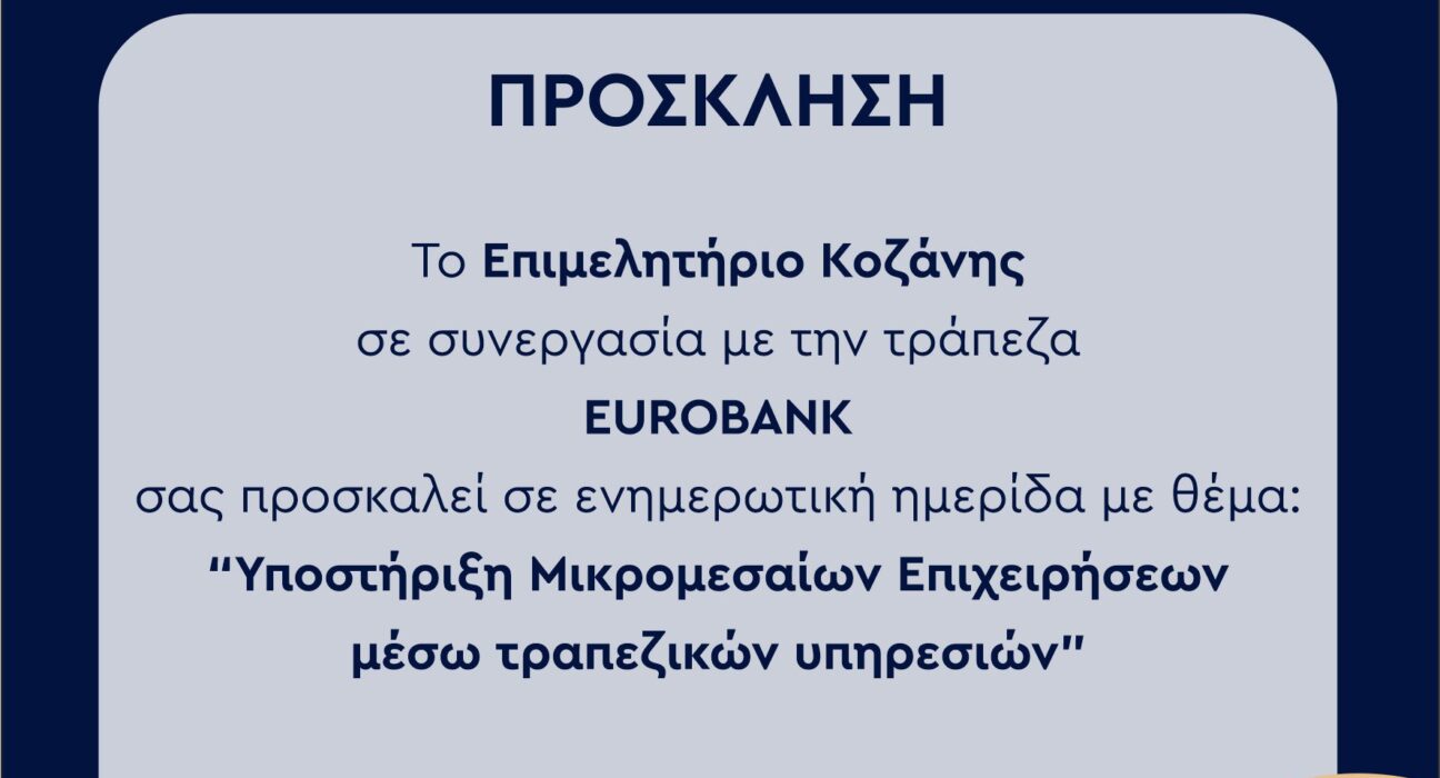 Στο πλαίσιο της συνεχούς στήριξης των Μικρομεσαίων Επιχειρήσεων της περιοχής μας, το Επιμελητήριο Κοζάνης σε συνεργασία με την EUROBANK διοργανώνει ενημερωτική ημερίδα με θέμα: «Υποστήριξη Μικρομεσαίων Επιχειρήσεων μέσω Τραπεζικών Υπηρεσιών».