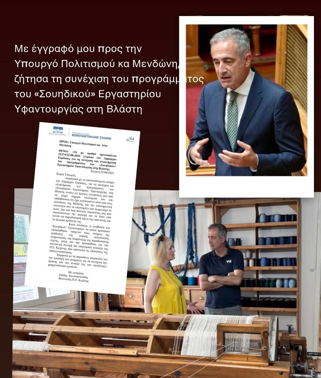 Τη συνέχιση και ολοκλήρωση του προγράμματος του «Σουηδικού» Εργαστηρίου Υφαντουργίας στη Βλάστη ζητά με έγγραφό του προς την Υπουργό Πολιτισμού, κ. Λίνα Μενδώνη, ο βουλευτής Π.Ε. Κοζάνης, κ. Στάθης Κωνσταντινίδης.