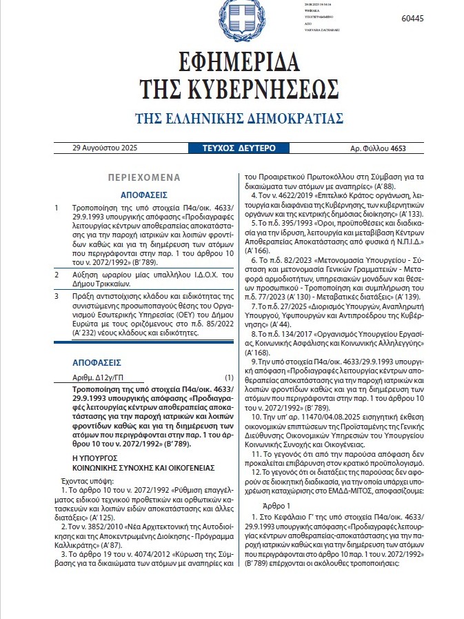 Ιδιαίτερη σημασία έχει η δημοσίευση του ΦΕΚ για την τροποποίηση της Υπουργικής Απόφασης που αφορά τα Κέντρα Διημέρευσης και Ημερήσιας Φροντίδας (ΚΔΗΦ). Στο σχετικό πλαίσιο εντάσσεται και η ΚΟΙΝΣΕΠ «Λαμπηδόνες», γεγονός που διασφαλίζει την ομαλή λειτουργία και ενδυναμώνει τον κοινωνικό της ρόλο.