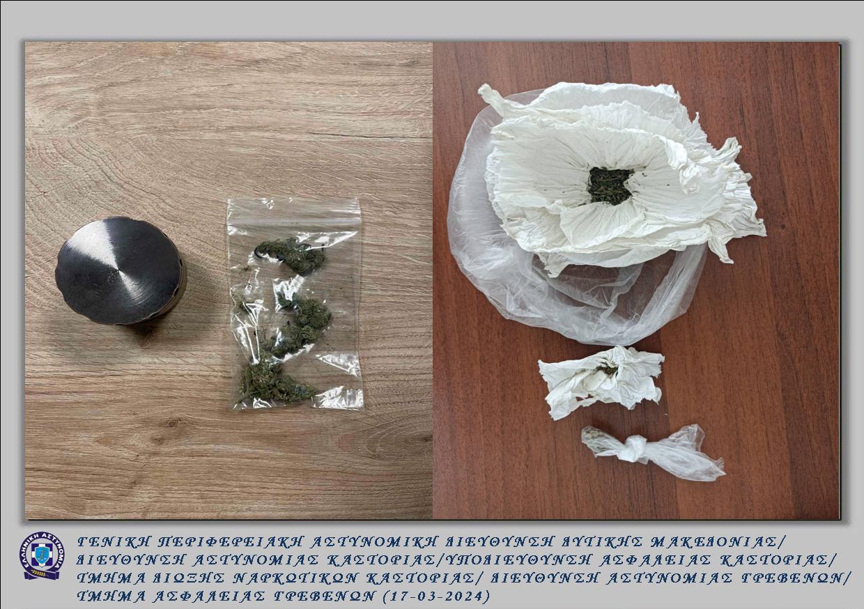• στη δεύτερη περίπτωση, συνελήφθη την 10-03-2024 το βράδυ στην πόλη της Καστοριάς, από αστυνομικούς του Τμήματος Δίωξης Ναρκωτικών της Υποδιεύθυνσης Ασφάλειας Καστοριάς, 21χρονοςημεδαπός, διότι στην κατοχή του βρέθηκαν και κατασχέθηκαν μικροποσότητα ακατέργαστης κάνναβης και -1- τρίφτης με υπολείμματα κάνναβης,