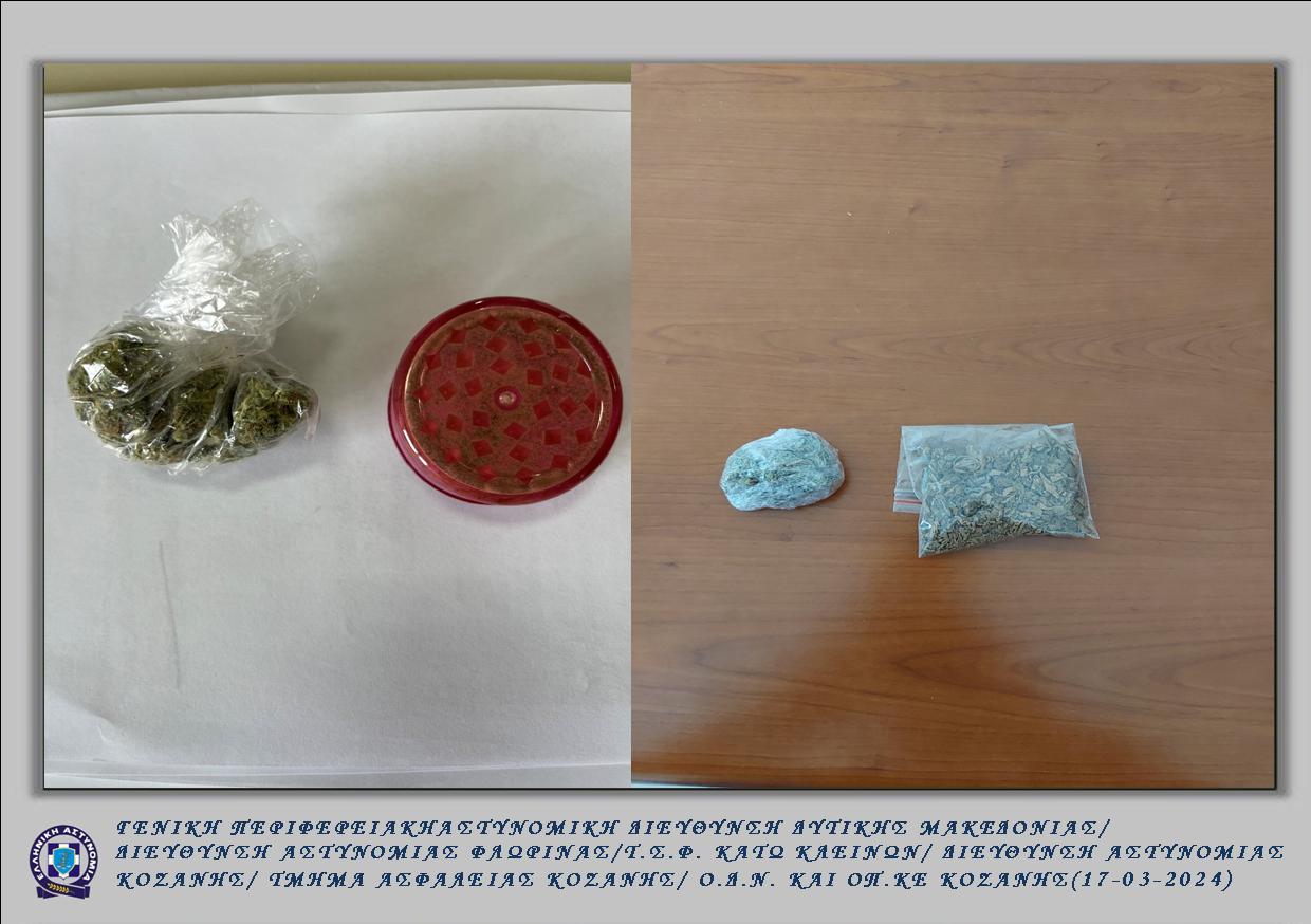 • στην πέμπτη περίπτωση, συνελήφθησαν την 15-03-2024 το βράδυ σε περιοχή της Κοζάνης, από αστυνομικούς της Ομάδας Πρόληψης και Καταστολής Εγκληματικότητας (Ο.Π.Κ.Ε.) Κοζάνης σε συνεργασία με αστυνομικούς της Ομάδας Δίωξης Ναρκωτικών του Τμήματος Ασφάλειας Κοζάνης, -2- ημεδαποί, ηλικίας 19 και 21 ετών, διότι σε έλεγχο που πραγματοποιήθηκε, βρέθηκαν στην κατοχή τουςκαι κατασχέθηκαν συνολικά -5,5- γραμμάρια ακατέργαστης κάνναβης και -1- τρίφτης με υπολείμματα κάνναβης και