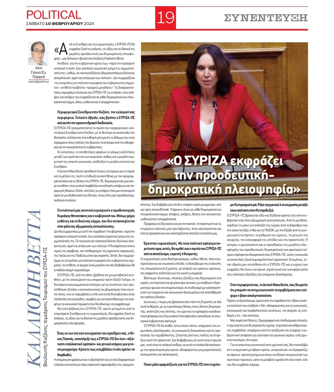 Συνέντευξη της βουλευτή Κοζάνης και τομεάρχη Τουρισμού του ΣΥΡΙΖΑ- Π.Σ., Καλλιόπης Βέττα, στην εφημερίδα Political