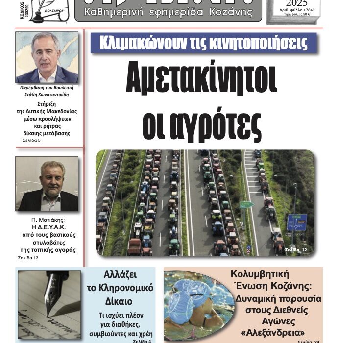 Η πρώτη σελίδα αποτυπώνει ένα ιδιαίτερα φορτισμένο κοινωνικοοικονομικό σκηνικό. Στο επίκεντρο βρίσκονται οι αγροτικές κινητοποιήσεις, που κλιμακώνονται με μαζικά μπλόκα στους δρόμους, υπογραμμίζοντας τη δυσαρέσκεια του πρωτογενούς τομέα απέναντι στις πιέσεις και τις εκκρεμότητες που αντιμετωπίζει. Παράλληλα, η τοπική πολιτική επικαιρότητα εστιάζει στα ζητήματα στήριξης της Δυτικής Μακεδονίας ενόψει της μεταλιγνιτικής περιόδου, ενώ η οικονομία και η καθημερινότητα επηρεάζονται από αλλαγές στο κληρονομικό δίκαιο, που φαίνεται να αναδιαμορφώνουν ισορροπίες σε περιουσιακά και οικογενειακά θέματα.