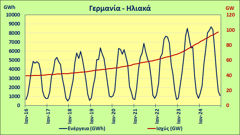 Αντίθετα με τα αιολικά, στο διάγραμμα για τα Γερμανικά ηλιακά η κατάσταση είναι εντελώς διαφορετική: όσο αυξάνονται οι εγκαταστάσεις φωτοβολταϊκών, εντελώς αντίστοιχα αυξάνεται η παραγόμενη ενέργεια. Γι’ αυτό και παγκοσμίως η αγορά επενδύει κυρίως σε φωτοβολταϊκά, αφήνοντας κατά μέρος τα αιολικά. Το χειμώνα βέβαια και τα ηλιακά πάνε για ύπνο, όπως άλλωστε κάνουν κάθε βράδυ, ανεξαρτήτως εποχής. Έτσι, όταν συμπέσει άπνοια με συννεφιά, (Dunkelflaute το λένε οι Γερμανοί), όσα αιολικά και φωτοβολταϊκά και να έχει κανείς, το αποτέλεσμα είναι προδιαγεγραμμένο. Πάνω από 170 χιλιάδες μεγαβάτ των δήθεν ΑΠΕ έχει εγκαταστήσει η Γερμανία, αλλά συμπαρέσυρε Δανία-Σουηδία-Νορβηγία στην ανασφάλεια ηλεκτροδότησης.