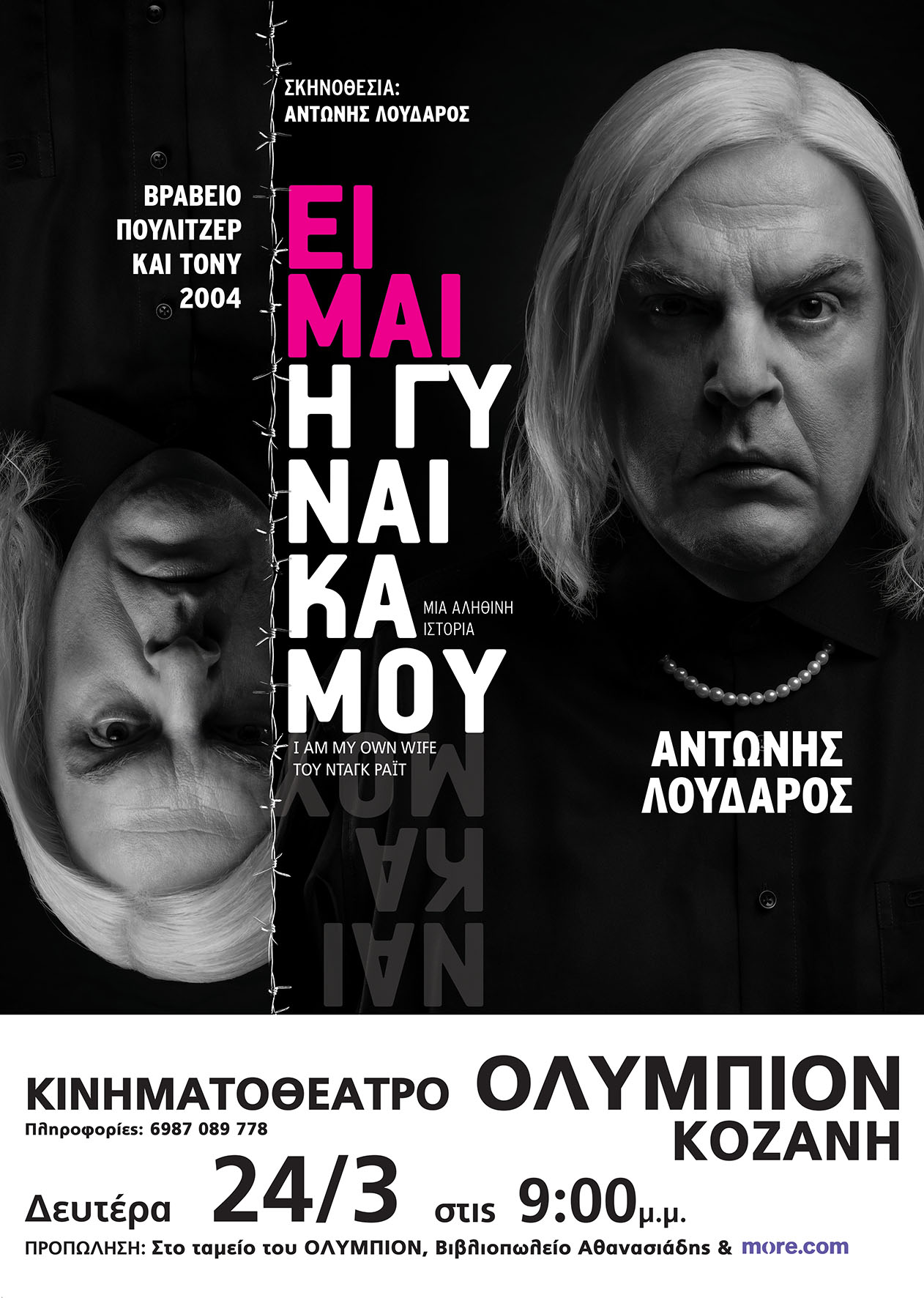 Με τη διπλή ιδιότητα του ερμηνευτή – σκηνοθέτη, ο ταλαντούχος ηθοποιός Αντώνης Λουδάρος, μετά τις καθηλωτικές παραστάσεις στην Αθήνα, φέρνει το βραβευμένο με Pulitzer και Tony θεατρικό μονόλογο του Doug Wright, «Είμαι η γυναίκα μου» στην Κοζάνη .