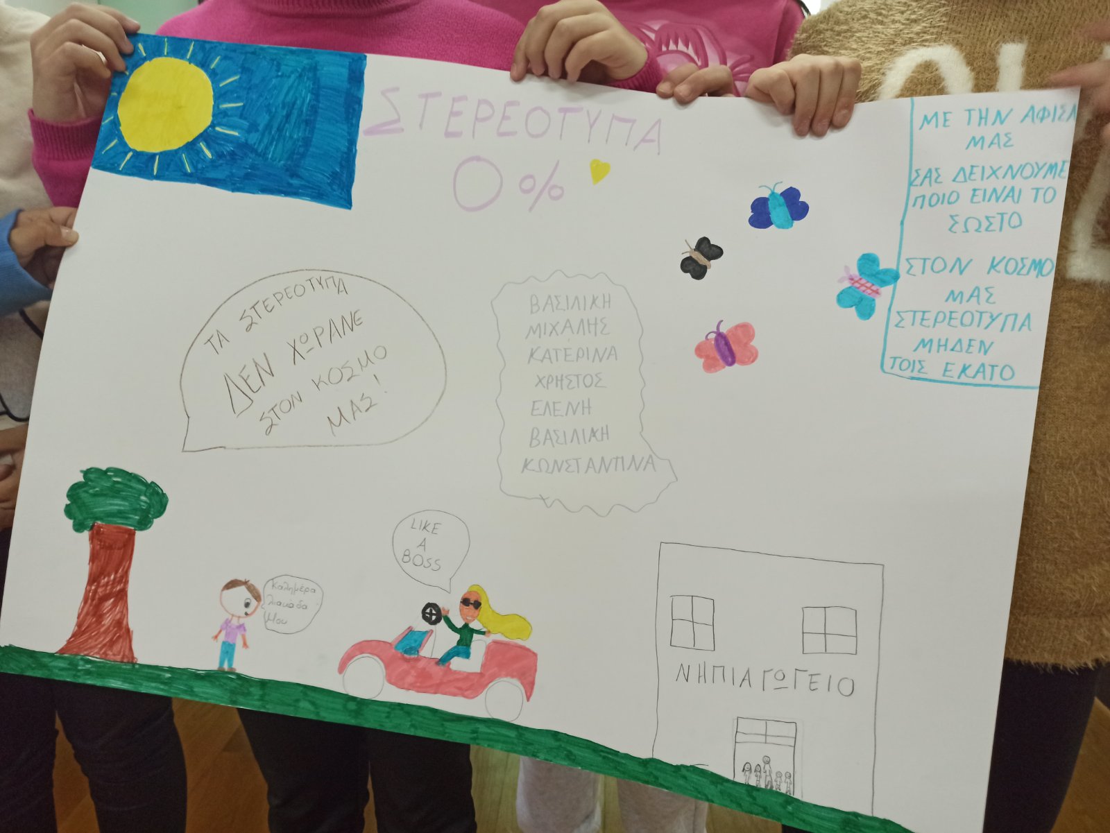 Μέσα από τη συγκινητική αφήγηση της ιστορίας της Μαλάλα Γιουσαφζάι και τη χρήση βιωματικών εργαλείων, όπως ο «Καθρέφτης των Στερεοτύπων», τα παιδιά κλήθηκαν να προβληματιστούν για τις «ταμπέλες» που περιορίζουν τόσο τα αγόρια όσο και τα κορίτσια. Οι μαθητές και οι μαθήτριες συμμετείχαν ενεργά, συζήτησαν, εξέφρασαν προσωπικούς προβληματισμούς και οραματίστηκαν έναν κόσμο ισότητας και αλληλοσεβασμού, αποτυπώνοντας τις σκέψεις τους μέσα από ομαδικές εικαστικές δημιουργίες.