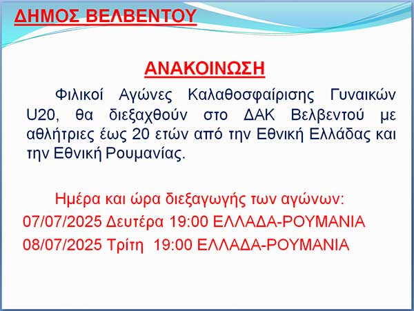 Φιλικοί Αγώνες Καλαθοσφαίρισης Γυναικών U20, θα διεξαχθούν στο ΔΑΚ Βελβεντού με αθλήτριες έως 20 ετών από την Εθνική Ελλάδας και την Εθνική Ρουμανίας.