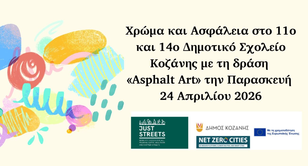 Την Παρασκευή 24 Απριλίου 2026 και ώρες 08:30 το πρωί με 13:00 το μεσημέρι, μαθητές του 11ου & του 14ου Δημοτικού Σχολείου Κοζάνης, με τη συνδρομή – καθοδήγηση μαθητών από το Τμήμα Εικαστικών του Δημόσιου Ωνασείου Λυκείου, μαζί με εικαστικούς, θα χρωματίσουν το οδόστρωμα με διαδραστικά σχέδια (πλανήτες, αριθμούς, γράμματα).