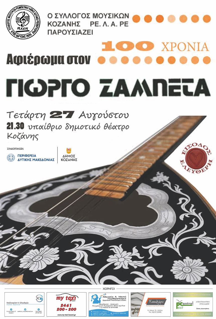 Στο πλαίσιο των 43ων Λασσανείων, ο Δήμος Κοζάνης προσκαλεί όλους τους δημότες στο μεγάλο μουσικό αφιέρωμα για τον Γιώργο Ζαμπέτα, που θα πραγματοποιηθεί από τον Σύλλογο Μουσικών Κοζάνης «ΡΕ.ΛΑ.ΡΕ» τηνΤετάρτη 27 Αυγούστου στις 21:30 το βράδυ στο Υπαίθριο Δημοτικό Θέατρο Κοζάνης, με ελεύθερη είσοδο για το κοινό.