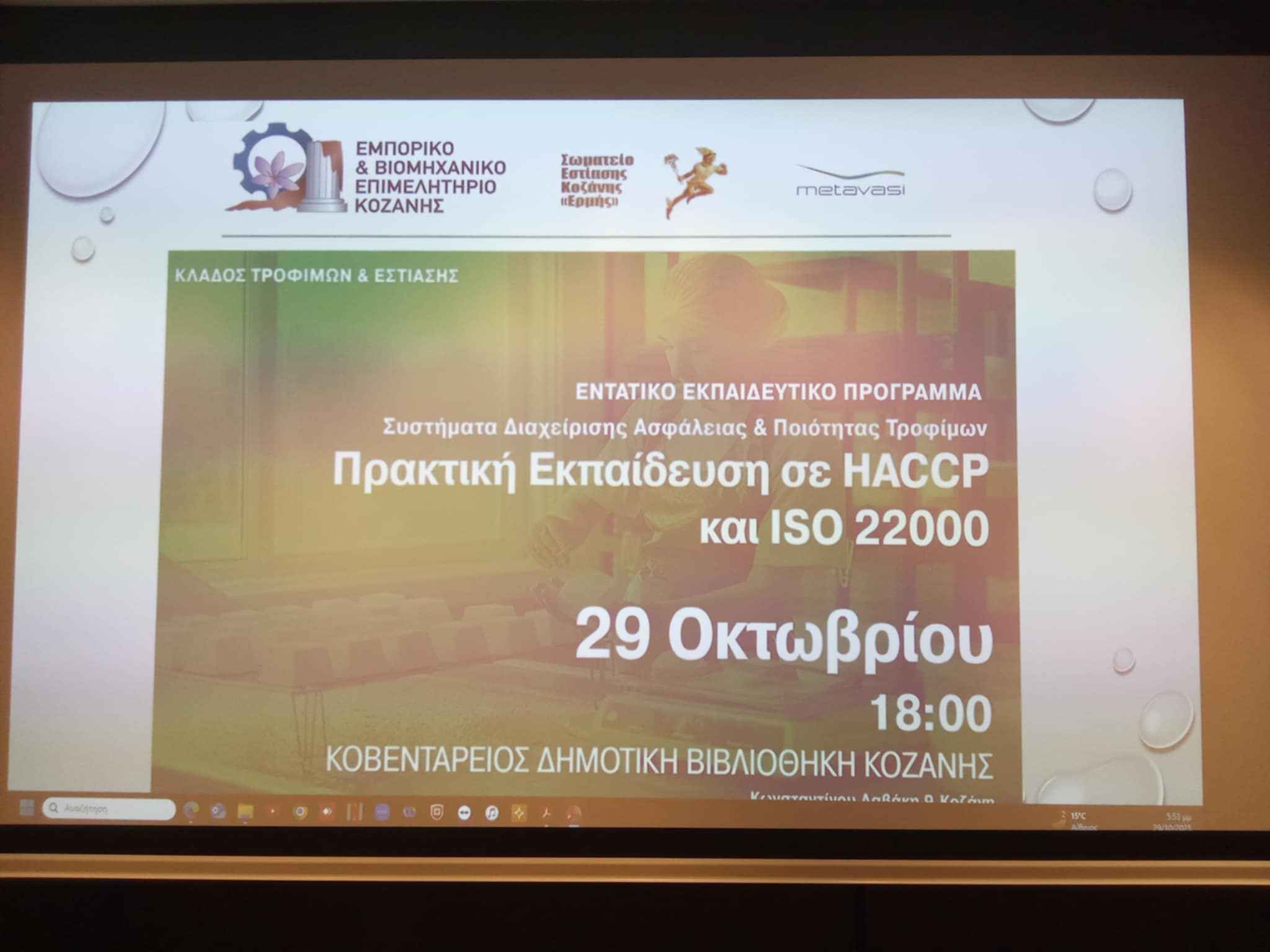 Με ιδιαίτερη επιτυχία πραγματοποιήθηκε την Τετάρτη 29 Οκτωβρίου 2025, στην Κοβεντάρειο  Δημοτική Βιβλιοθήκη Κοζάνης, το εντατικό εκπαιδευτικό πρόγραμμα με τίτλο «Πρακτική Εκπαίδευση σε HACCP και ISO 22000», που διοργάνωσε το Επιμελητήριο Κοζάνης, σε συνεργασία με το Σωματείο Εστίασης Κοζάνης «Ερμής»και την εταιρεία MΕΤΑΒΑΣΗ Μ.Α.Ε.