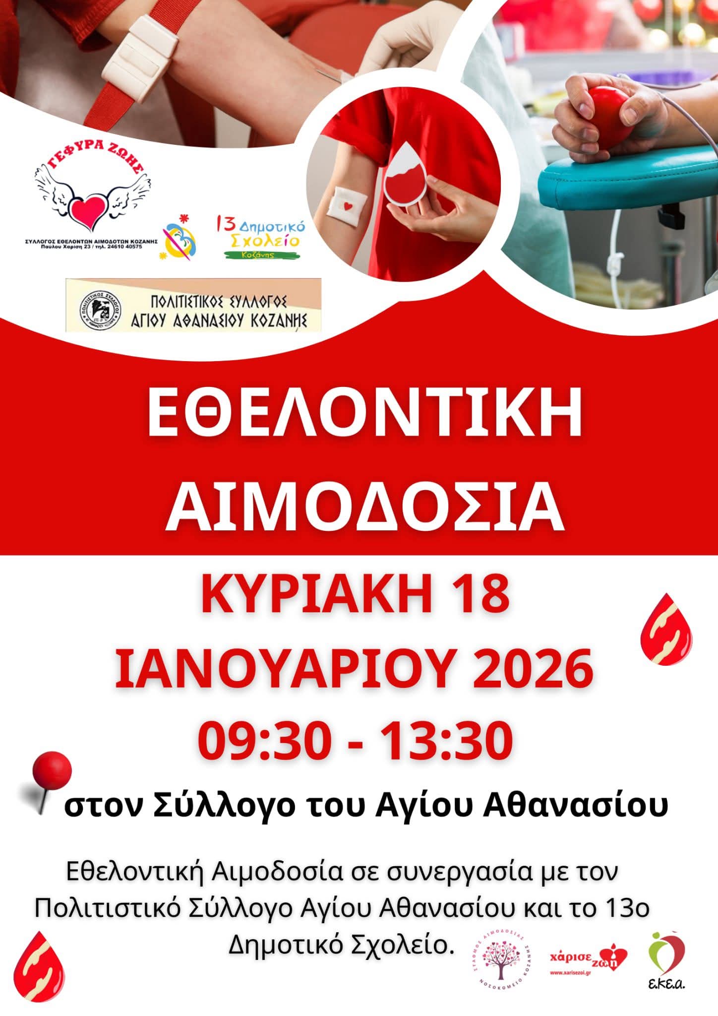 Αιμοδοσία στο χώρο του Πολιτιστικού  Συλλόγου Αγίου Αθανασίου  την Κυριακή 18 Ιανουαρίου