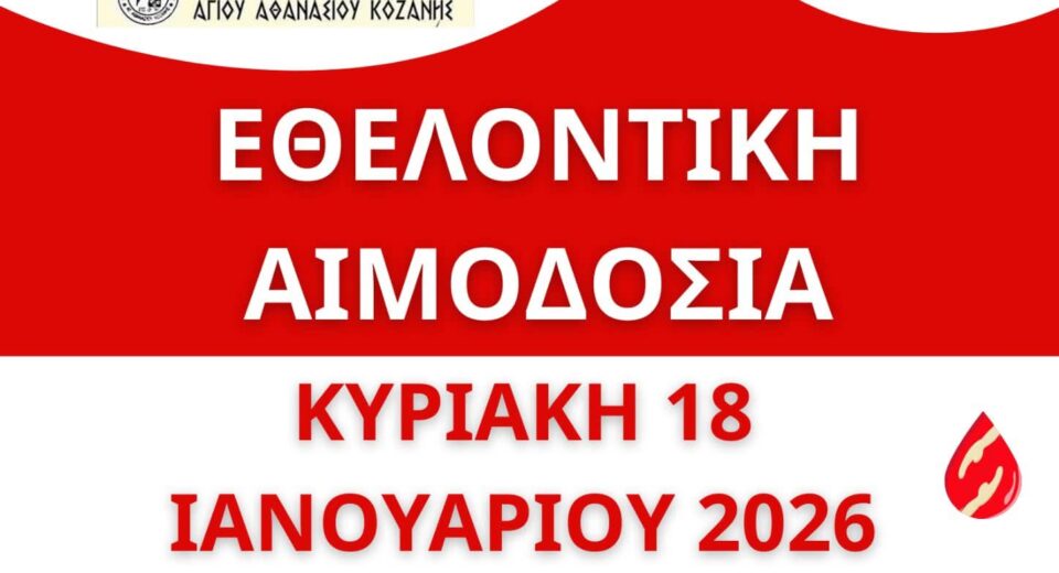 Την Κυριακή 18 Ιανουαρίου 2026 από τις 09:30 – 14:00, (προσέλευση μέχρι 13:30), στο χώρο του Πολιτιστικού Συλλόγου του Αγίου Αθανασίου δίνουμε αίμα, τιμώντας την εορτή του Αγίου Αθανασίου (18/1), σε συνεργασία με το τμήμα Αιμοδοσίας του Γ.Ν. Κοζάνης και το σύλλογο Γονέων & Κηδεμόνων του 13ου Δημοτικού Σχολείου. «Να είσαι εκεί για τον […]