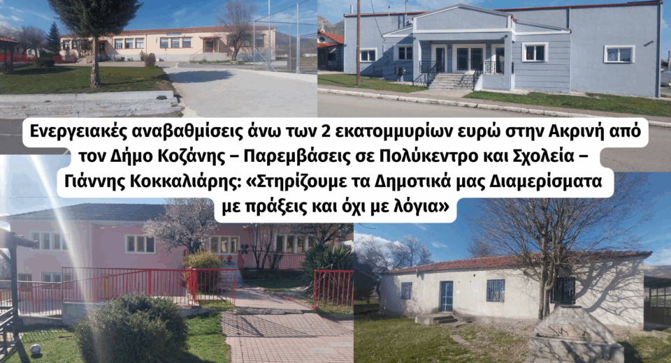 Ενεργειακές αναβαθμίσεις άνω των 2 εκατομμυρίων ευρώ στην Ακρινή από τον Δήμο Κοζάνης – Παρεμβάσεις σε Πολύκεντρο και Σχολεία