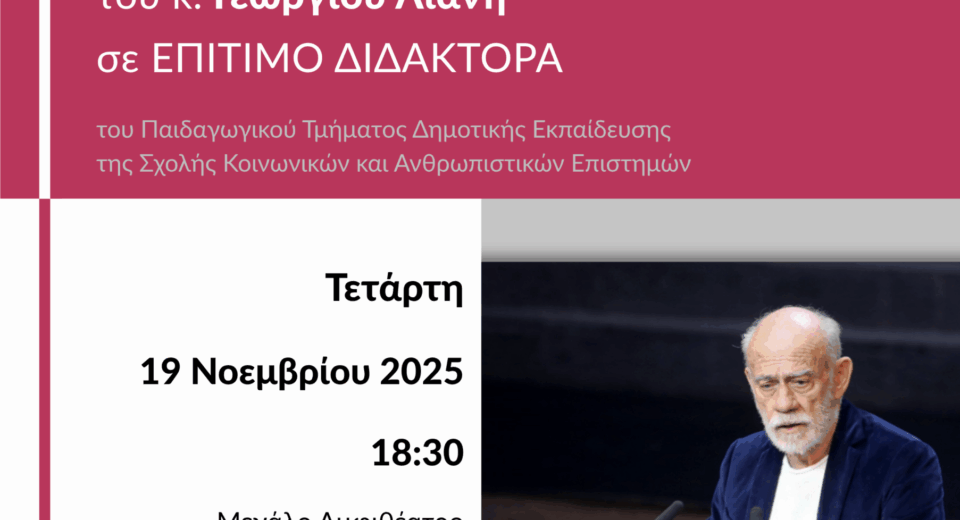 Σε Επίτιμο Διδάκτορα του Παιδαγωγικού Τμήματος Δημοτικής Εκπαίδευσης της Σχολής Κοινωνικών και Ανθρωπιστικών Επιστημών του Πανεπιστημίου Δυτικής Μακεδονίας αναγορεύεται ο Γεώργιος Λιάνης, στο πλαίσιο επίσημης τελετής που θα πραγματοποιηθεί την Τετάρτη 19 Νοεμβρίου 2025, στις 18:30, στο Αμφιθέατρο «Άννα Σπύρτου» στη Φλώρινα. Η αναγόρευση αποτελεί αναγνώριση της πολύχρονης και ουσιαστικής συμβολής του στη δημοσιογραφία, τον […]