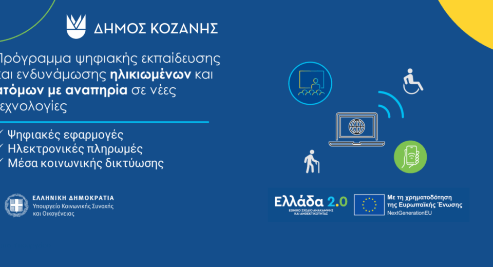 Ο Δήμος Κοζάνης εντάχθηκε στο Πρόγραμμα Ψηφιακής Εκπαίδευσης και Ενδυνάμωσης Ηλικιωμένων και Ατόμων με Αναπηρία